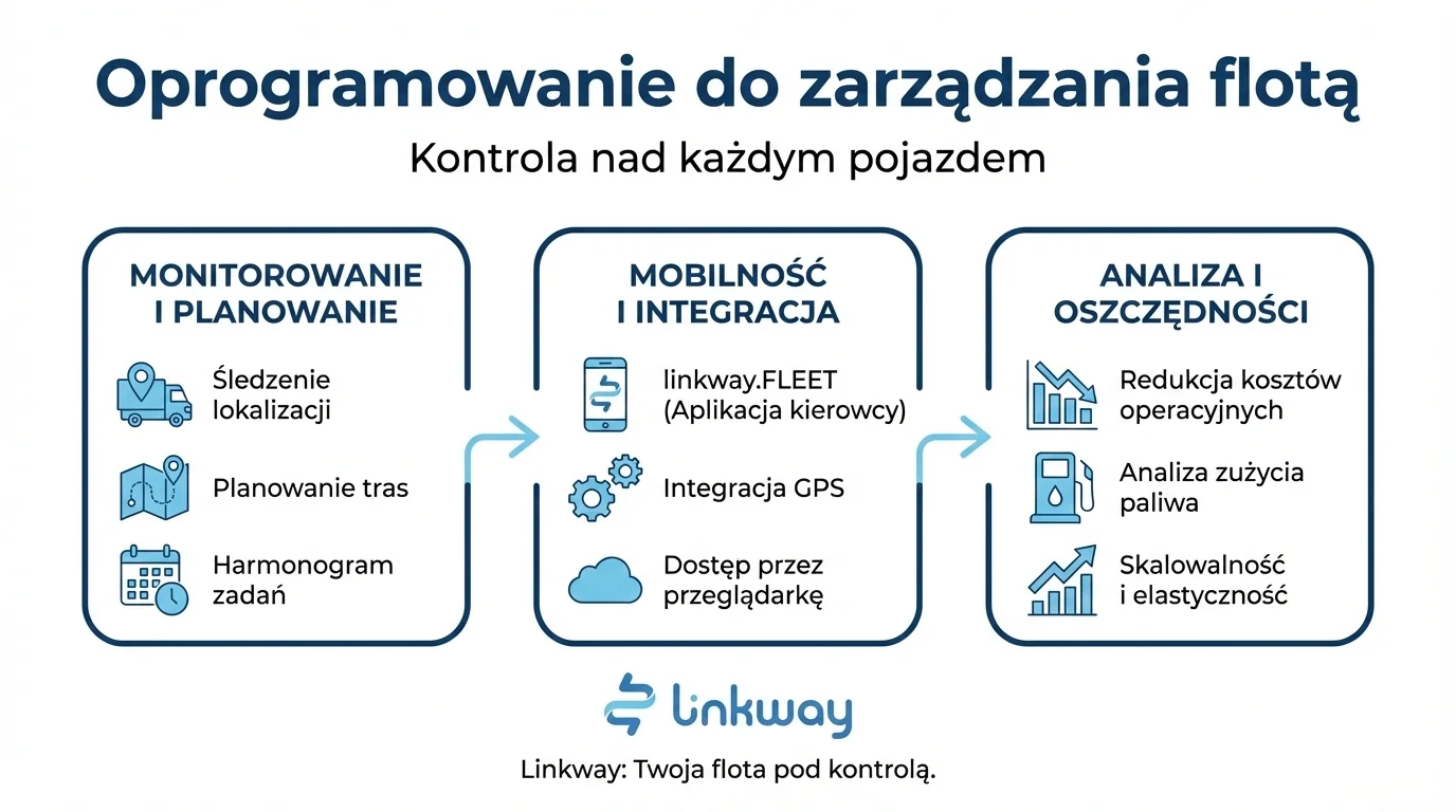 Linkway działa przez przeglądarkę, nie wymaga instalacji i skaluje się wraz z rozwojem firmy – działa tak samo sprawnie przy flocie kilku pojazdów, jak i przy kilkuset.