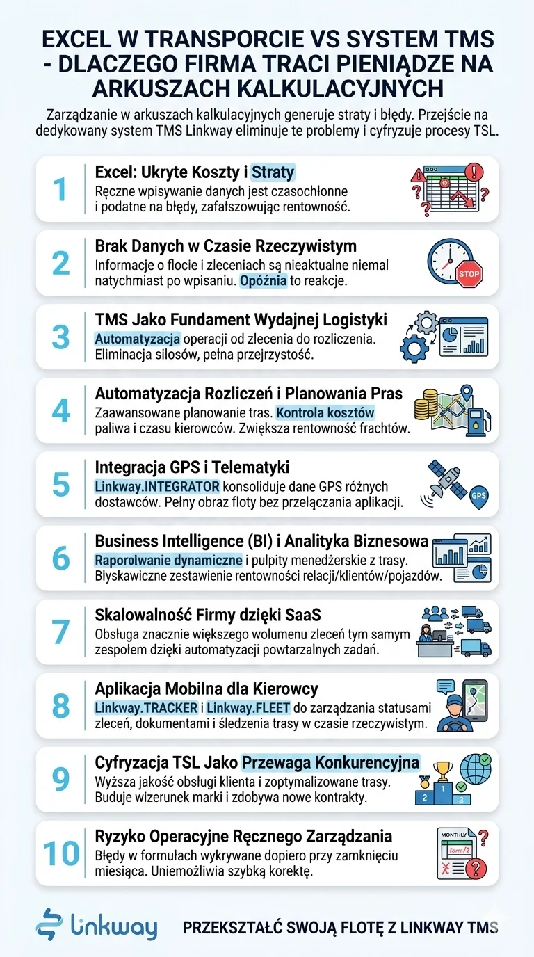 Wiele firm z branży TSL rozpoczyna swoją przygodę z zarządzaniem zleceniami od arkuszy kalkulacyjnych. Na pierwszy rzut oka wydaje się to rozwiązaniem prostym, tanim i elastycznym. Jednak wraz z rozwojem przedsiębiorstwa, ta pozorna prostota szybko zamienia się w chaos, który generuje realne straty finansowe i operacyjne. Ręczne wprowadzanie danych do setek komórek jest nie tylko czasochłonne, ale także niezwykle podatne na ludzkie błędy, które mogą kosztować firmę bardzo dużo.