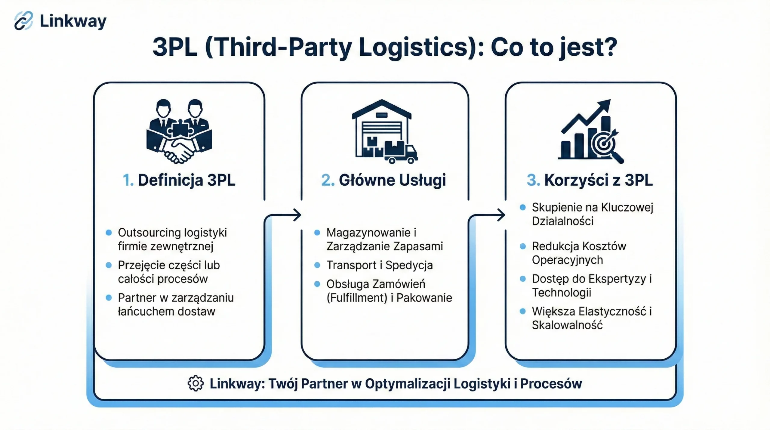 | 3PL (Third-Party Logistics) | Kompleksowa obsługa logistyki: magazynowanie, transport, kompletacja, dystrybucja | Dynamicznie rozwijające się sklepy internetowe, firmy e-commerce, przedsiębiorstwa planujące ekspansję | Zamiana kosztów stałych na zmienne, skalowalność, efekt skali, dostęp do zaawansowanych technologii (WMS, TMS) | Sklep internetowy zlecający fulfillment operatorowi 3PL z integracją przez linkway.INTEGRATOR |