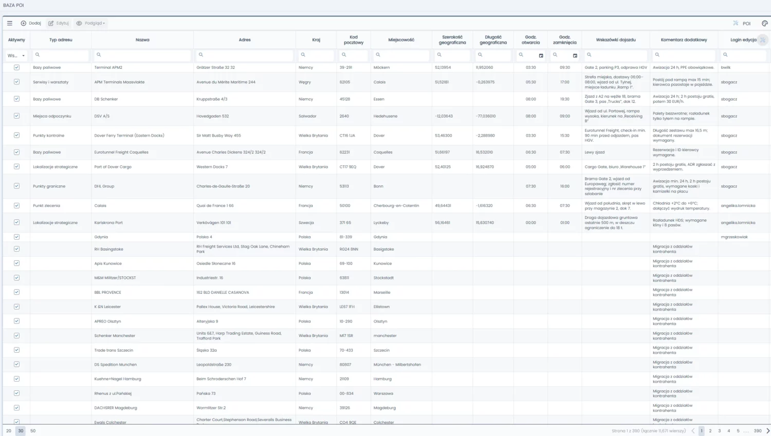 Widok rejestru punktów POI umożliwiający zarządzanie bazami paliwowymi, punktami kontrolnymi oraz strategicznymi lokalizacjami kontrahentów.