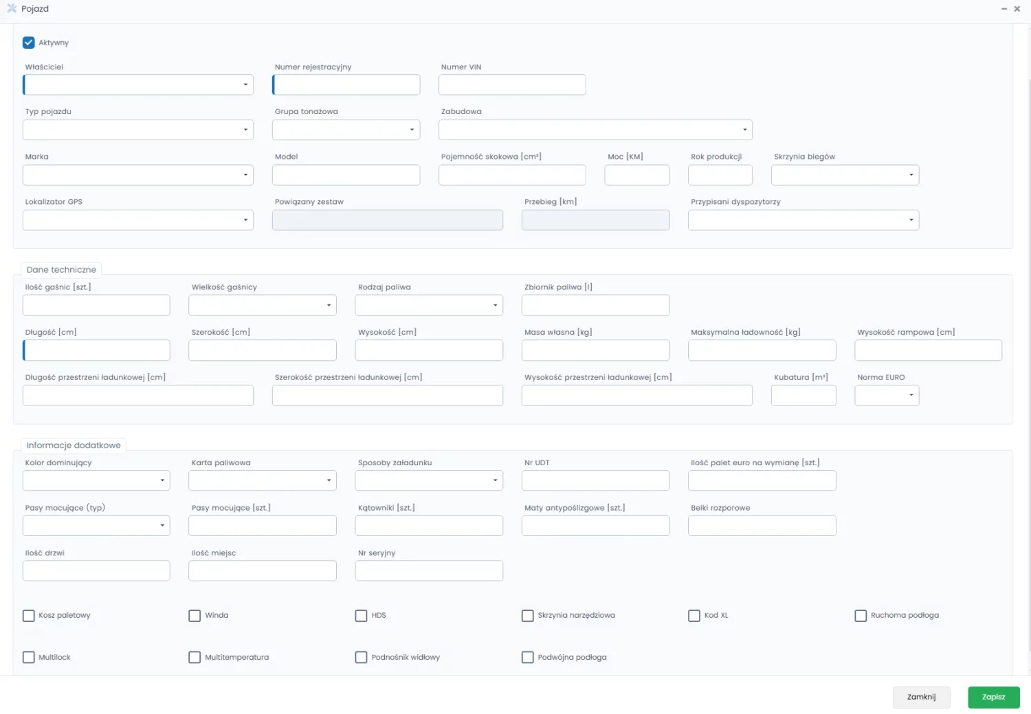 - Opcje specjalistyczne (checkboxy) – lista dostępnych udogodnień, takich jak: kosz paletowy, winda, HDS, kod XL, ruchoma podłoga, multitemperatura czy podwójna podłoga.